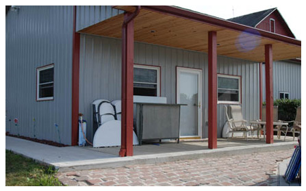 Project elements: Wood frame construction; Painted steel siding; Shingle roof; Concrete foundation and floor; Open porches