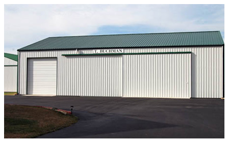 Project elements: Post frame construction; Painted steel roofing, siding and trim; Concrete floor; Engineered nail laminated posts; 24x14 sliding door; Overhead door; Roof eave overhang